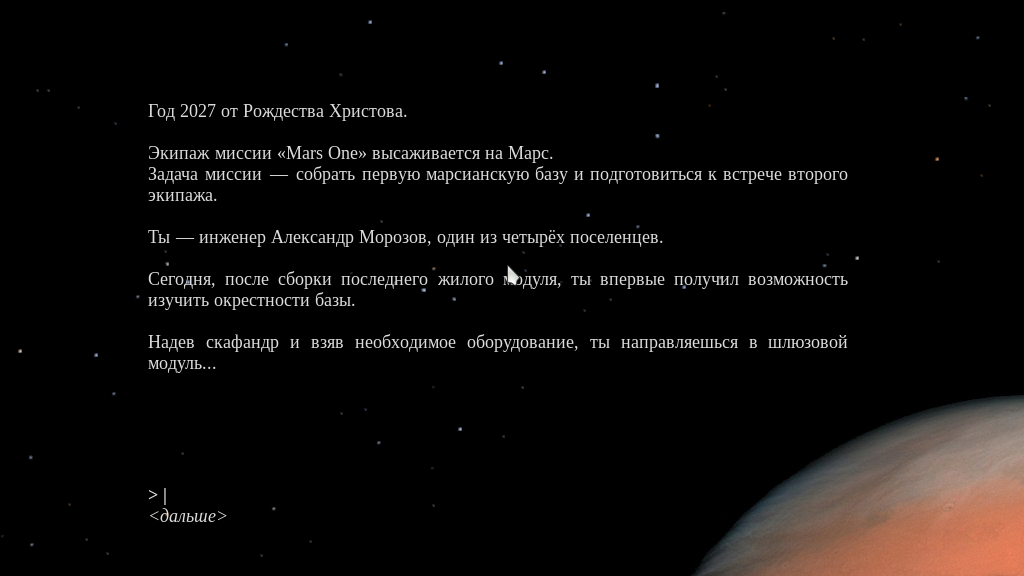 2027 A.D. The crew of the mission "Mars One" landed on Mars. Its mission is to establish the first Martian base and prepare for the second crew arrival. You are engineer Alexander Morozov, one of the four settlers. Today, after the assembly of the last residential module, you got the opportunity to explore the surroundings of the base for the first time. |