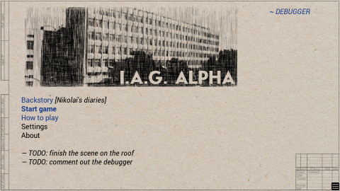 You may think this game is about a post-Soviet Research Institute. About an experiment that went out of control. You may think that the initials "I.A.G." are somehow related to the Institute. You may think this game is unfinished. You may even think that the game ends exactly as the author tells you.